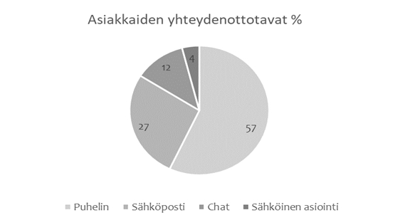 Vuoden aikana asiakaspalvelumme sai yhteydenottoja melkein 28 000 kappaletta. Puhelin oli ylivoimaisesti suosituin yhteydenottotapa ja toisena oli sähköposti. Otimme sähköisen asioinnin käyttöön noin vuosi sitten, ja sen osuus on kasvanut kuukausi kuukaudelta. Asiakkaat ovat olleet tyytyväisiä, kun pystyvät asioimaan joustavasti monella eri tapaa.